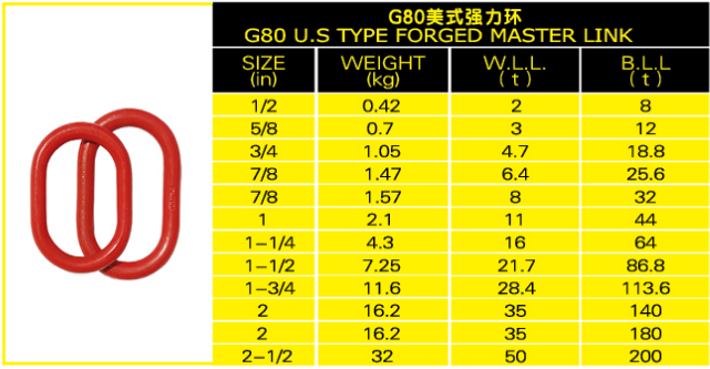 美式G80索具吊環是一種高強度的起重工具,通常用于吊裝、吊點固定、懸掛等場合,比如叉車連接油桶鉗使用、多肢組合鏈條索具的吊點等。