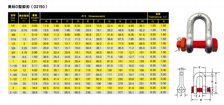 美標D型卸扣 G2150能夠在電力,施工等多種場所之中進行固定或者是吊運等工作,有一些卸扣橫銷部位有螺紋設置。橫銷位于卸扣的開口處,也是卸扣連接其他部件的位置,橫銷與卸扣之間連接的緊密性與吊運工作的安全性息息相關,使用美標D型卸扣進行重物提升時,人們需要注意檢查卸扣的橫銷部位是否安全。還有一些D型卸扣的橫銷部位帶有螺母加固功能,它們一端是卸扣的突出部位,能夠幫助人們更方便的取放,而另一端是螺母,能夠較好的固定卸扣,以防其在吊運過程中出現脫落的危險。